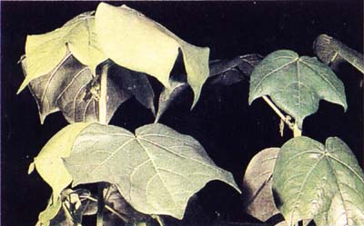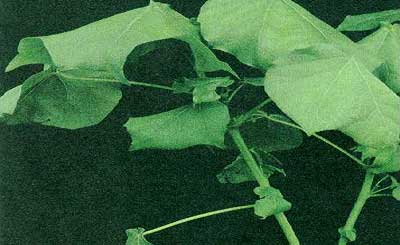 برگها ضخيم شده و در اثر پيچيدگي لبه برگها به طرف بالا شكسته ميشوند. بافتهاي بين رگبرگي بيرنگ شده و در حالت كمبود شديد به صورت قهوهاي در ميآيند. غنچهها و گلهايي كه قبل از مشاهده علائم كمبود پديدار گردند، ميريزند. تاخير رشد همراه با كاهش غوزهها و كوچك شدن آنها سبب كاهش مقدار محصول و كيفيت آن خواهد شد.