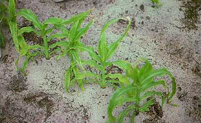 زرد شدن برگهاي جوان اولين علامت كمبود است. با افزايش كمبود رنگ زرد برگها به سفيدي ميگرايد. در حالت كمبود خفيف رگبرگها سبز باقي ميمانند.