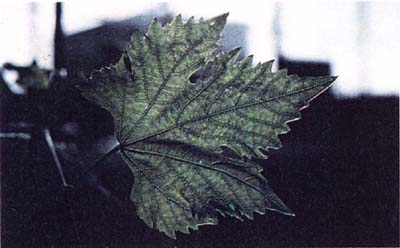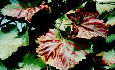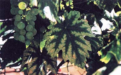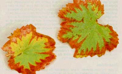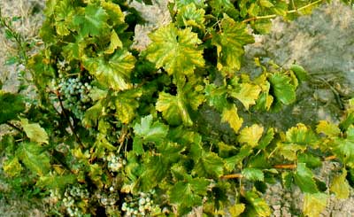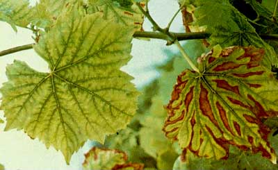 علائم كمبود منيزيم در روي برگها با تغيير رنگ منطقهاي بين رگبرگها و حاشيه برگهاي پير به رنگ قرمز يا قهوهاي ظاهر ميگردد. كمبود منيزيم در خوشههاي انگور باعث بيرنگي در روي ساقه و از بين رفتن انگور و حتي تمامي خوشه ميگردد. اين حالت اغلب بخاطر مقدار ناچيز منيزيم در دسترس خاك بهعلت سطح بالاي پتاسيم و يا بخاطر ذخيره خاص ريشه ميباشد.