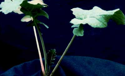 كاهش پهنك برگ و افزايش رگبرگ مياني مشابه شلاقي (whiplail) شدن در كلم گل، زردي و نرم شدن برگ و كم شدن محصول غلاف در مقايسه با گياه سالم.