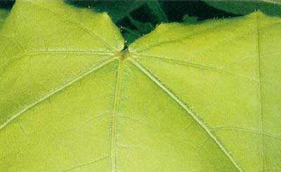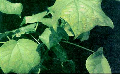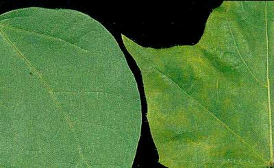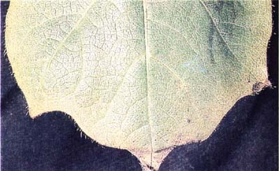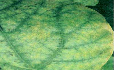 برگهاي جوان حالتي بيرنگ به خود ميگيرند و هر برگي كه ظاهر ميگردد از برگهاي قبل زردتر خواهد شد. رگبرگها به صورت سبز باقي مانده و برگهاي آلوده به تدريج پژمرده و نرم ميگردند. گياه قدرت خود را از دست ميدهد و محصول كاهش مييابد.