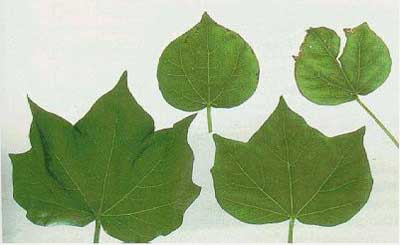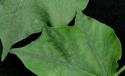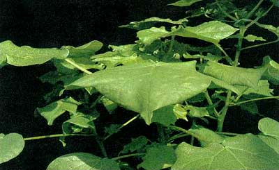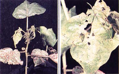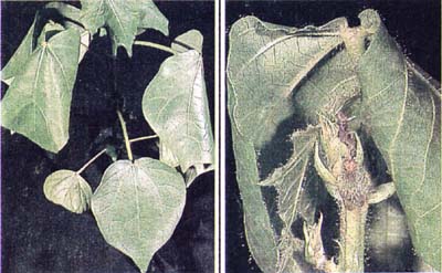 برگها ضخيم شده و در اثر پيچيدگي لبه برگها به طرف بالا شكسته ميشوند. بافتهاي بين رگبرگي بيرنگ شده و در حالت كمبود شديد به صورت قهوهاي در ميآيند. غنچهها و گلهايي كه قبل از مشاهده علائم كمبود پديدار گردند، ميريزند. تاخير رشد همراه با كاهش غوزهها و كوچك شدن آنها سبب كاهش مقدار محصول و كيفيت آن خواهد شد.