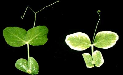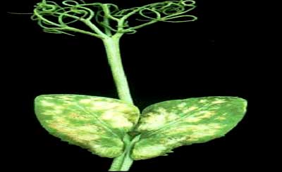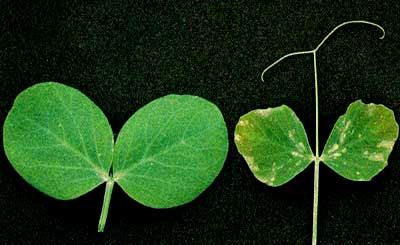 منطقه بين رگبرگها بهاستثناي پائين برگ به صورت رنگ پريده و يا زرد در ميآيند. برگهاي پير زودتر آلوده ميگردند.